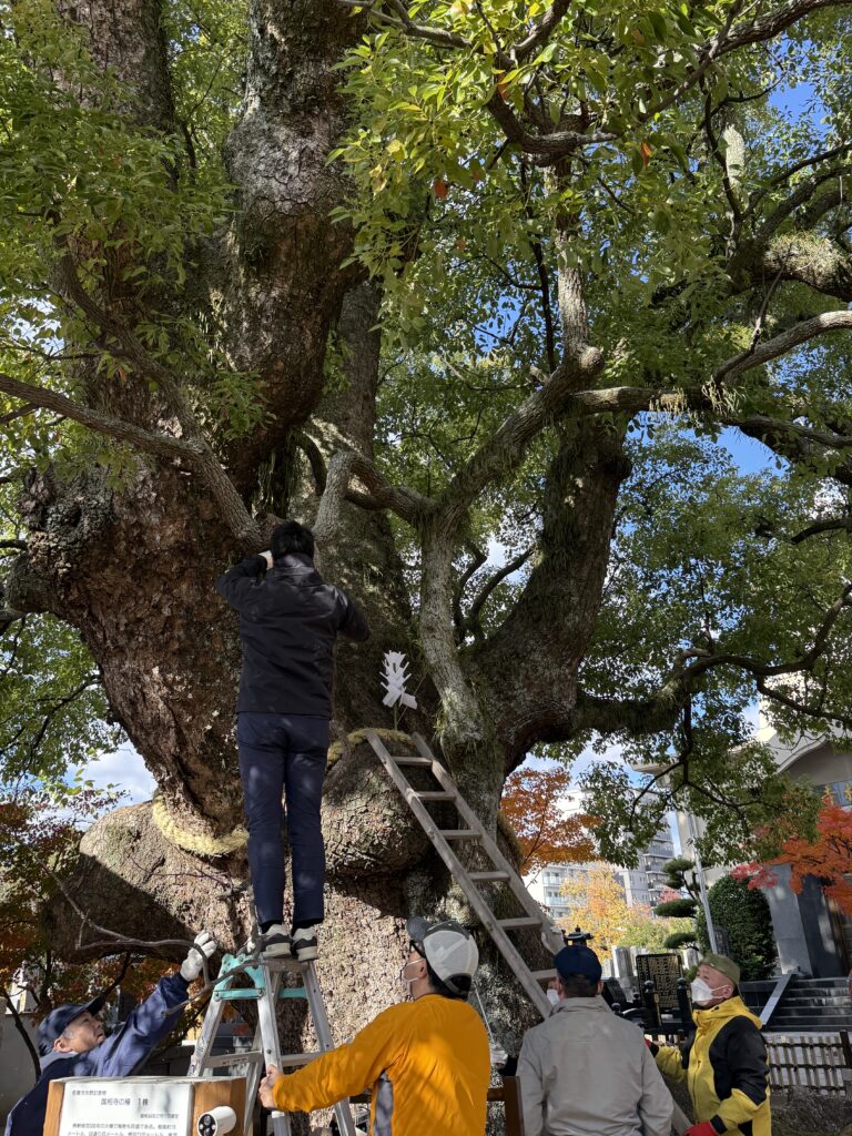 しめ縄はなかなかの力仕事で、國相寺の御神木でもある楠木の幹の周りをぐるりと飾ります。